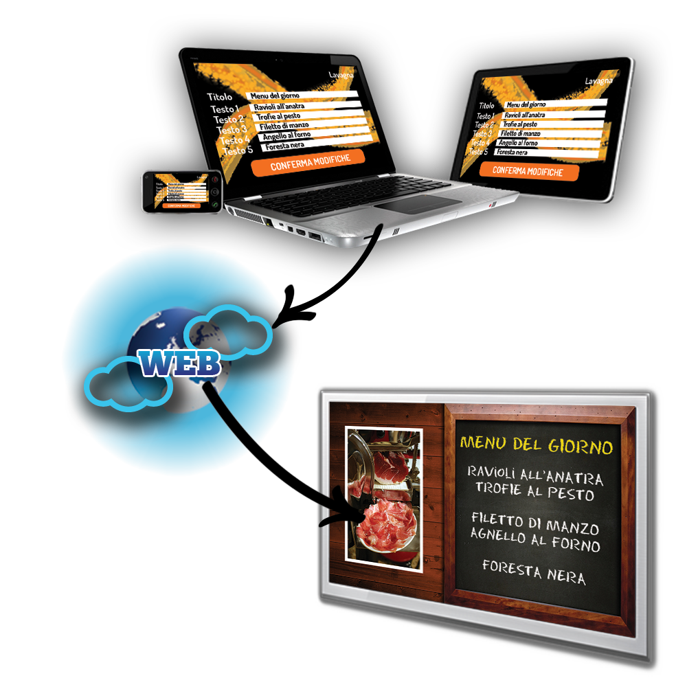 Con VIDEOTHRON i contenuti si possono aggiornare in totale autonomia e con la massima semplicità: da un PC oppure da un tablet o smartphone, è possibile utilizzare i nostri numerosissimi template precaricati per gestire il menù del giorno e le offerte promozionali, inserire immagini, video e testi, integrandoli con le informazioni in tempo reale da Internet (news, teteo locale).