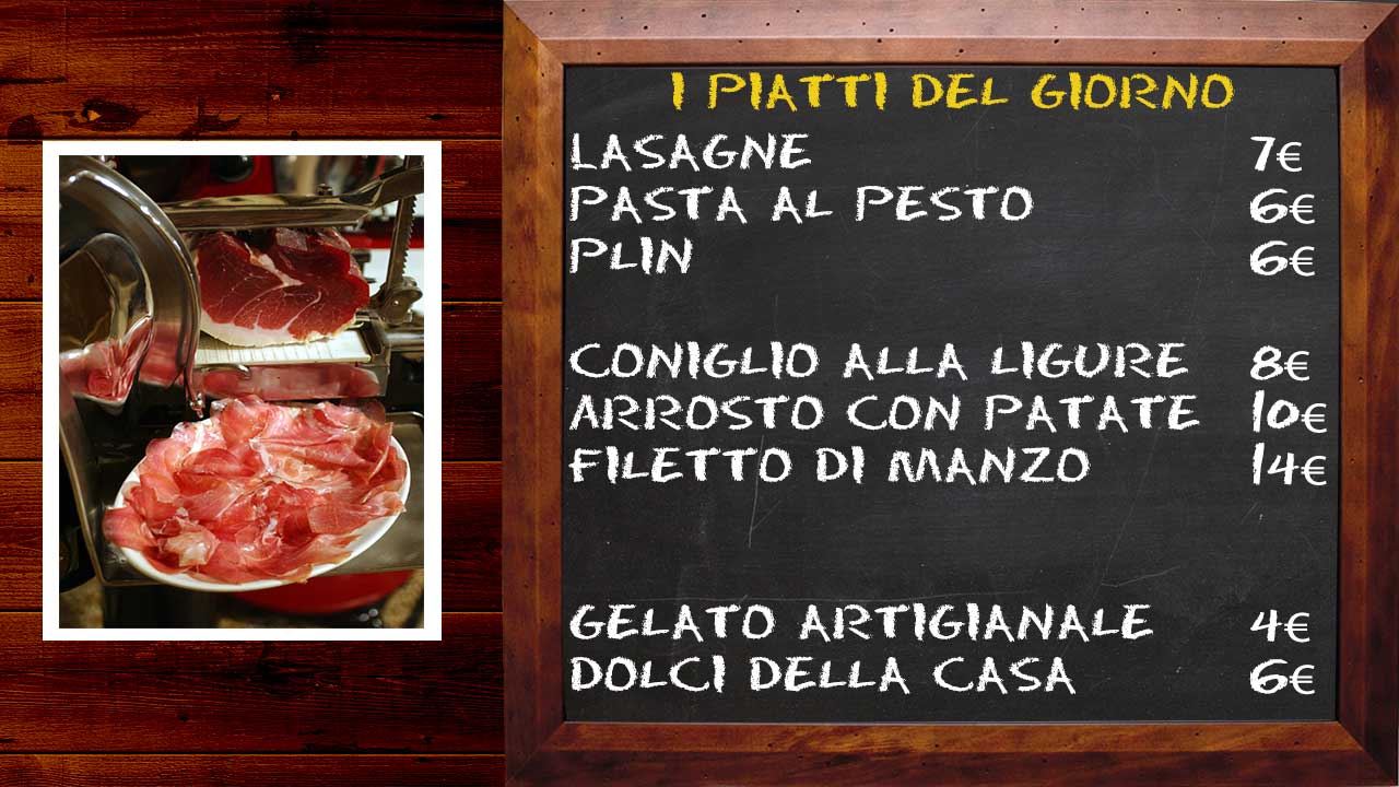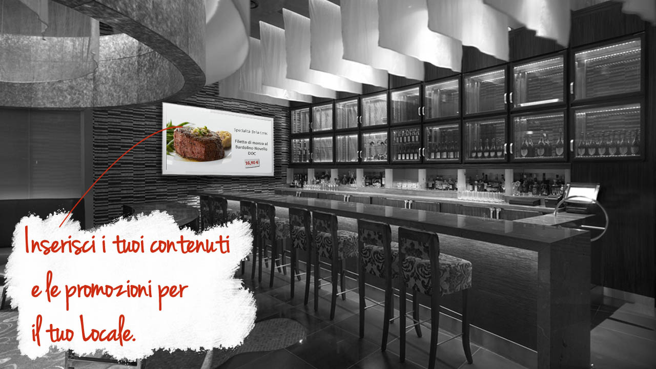 In questo senso abbiamo ipotizzato la suddivisione dello schermo in diverse aree per ottimizzare le informazioni (menù del giorno, particolari piatti, ricette) ed i messaggi promozionali del Locale, rendendo la Soluzione particolarmente attraente e stimolante sia per il passante che per il cliente quotidiano.