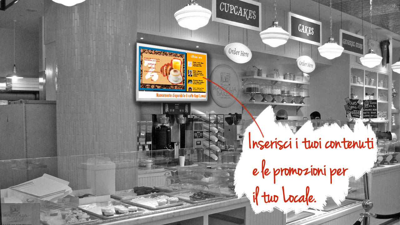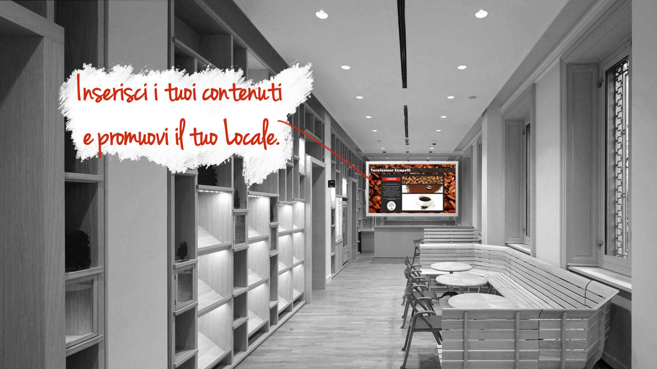 VIDEOTHRON è la Soluzione Digital Signage che abbiamo sviluppato specificamente per i Bar, le Torrefazioni, i Ristoranti, le Pizzerie e per tutti quei locali in cui si desideri attirare, informare e coinvolgere i potenziali clienti con una proposta dinamica, moderna ed accattivante.